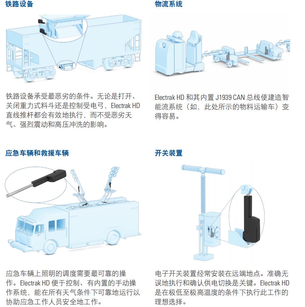 Electrak HD–更智能、更强健、更耐用除了先进的控制功能,相比于先前的设计,Electrak HD 的负载能力高出 50%,行程延长 60%,而且比负载相当的同类产品速度更快。这一新的操作的扩展设计也为液动应用向电动转换开辟了更广阔的范围。